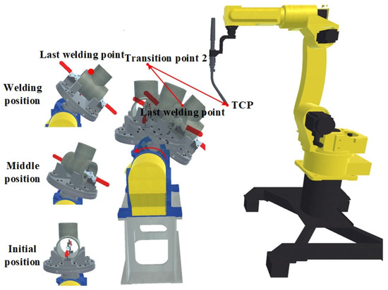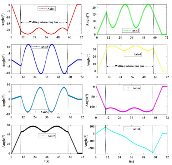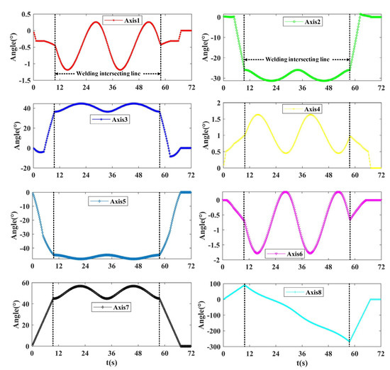 The path before processing of intersecting line, the welding path of intersecting lines, and the path after processing compose a complete synchronous cooperative motion path. Each axis’ rotation angle values of the 8-DOF system in the entire synchronous cooperative movement is calculated by the SCPP method. The welding torch did not interfere with the workpiece (in Figure 15), which indicates that the setting of planned points of P1 and P2 is effective.