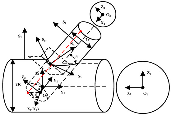 The general form of intersecting lines is obliquely offset (Figure 8). The origin of the main tube coordinate system is O1, and the origin of the branch tube coordinate system is O2. R and r represent the main tube radius and the branch tube radius, respectively. δ denotes the intersection angle between two tubes, and σ is the eccentricity of the two intersecting tube centers.