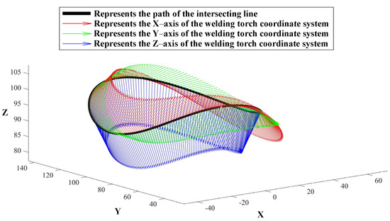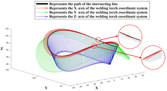 Take an intersection line as an example to draw the intersecting line path and welding torch orientation diagram in the main tube coordinate system, as shown in Figure 9. This intersecting line main tube radius R = 100 mm, the branch tube radius r = 40 mm, the intersecting angle δ = 90°, and the eccentricity σ = 0 mm. The number of interpolation points N is set as 200.