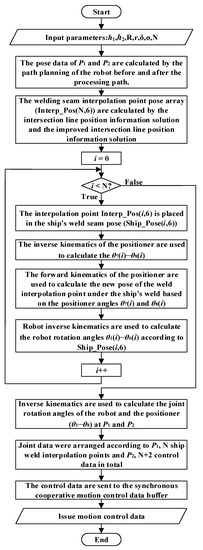 It is known that the distance from the 7-axis rotation center of the positioner to the upper surface of the workpiece table is h1, the distance from the upper surface of the workpiece table to the upper surface of the workpiece branch is h2, the radius of the main pipe is R, the radius of the branch pipe is r, the intersection angle is δ, the eccentricity is σ, the number of interpolation points is N, and other parameters. Through the solving methods introduced in Section 2 and Section 3, the position of the motion interpolation points of the 8-DOF system in the whole process are obtained, and the synchronous cooperative motion path of the robot and the positioner are planned. The overall process of the SCPP algorithm of robot and positioner is shown in Figure 12.