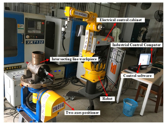 The welding workstation is mainly composed of a robot, two-axis positioner, electrical control cabinet, intersecting line workpiece, industrial control computer, and control software, as shown in Figure 13. The 8-DOF (6-DOF robot and two-axis positioner) system control software is developed independently by our group, which provides convenience for algorithm verification and data acquisition.