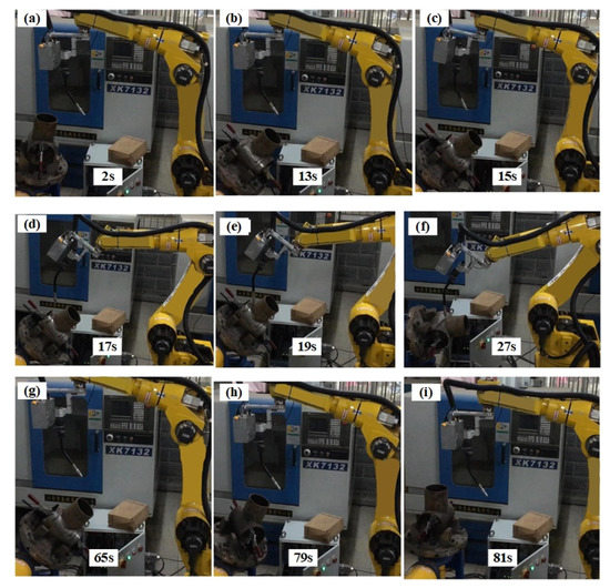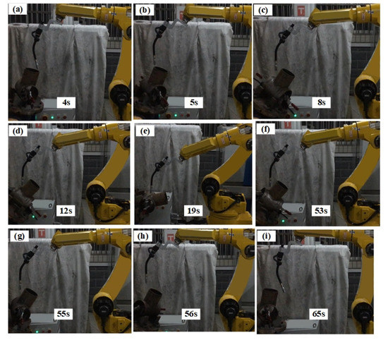 Synchronous cooperative movement process of robot and positioner. (a–d) are before processing; (e,f) are the process of welding intersecting lines; and (g–i) are after processing and return to zero.