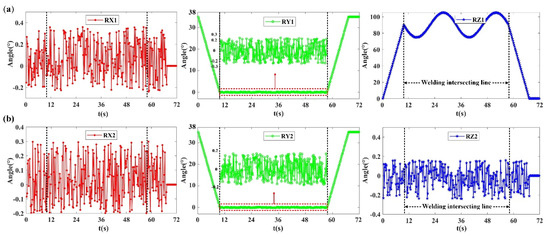 The orientation changes of the welding torch. (a) The orientation changes of the welding torch by using the traditional method of solving intersecting line orientation information and (b) the orientation changes of the welding torch by using the improved method of solving intersecting line orientation information.