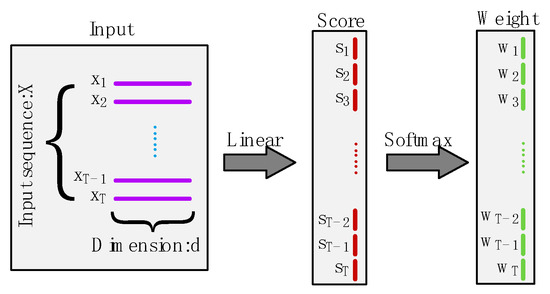 Generally, temporal context information is used to construct and learn such importance scores [43,44]. As an example, the attention mechanism proposed in [43] is shown in Figure 3. Given an input sequence of length , where represents the element of the sequence, , the dimension of is , and the attention weight is a scalar value , which represents the importance of the element in the entire sequence. The attention weight of the sequence can be expressed as . Usually, a set of linear layers or non-linear layers are used to calculate the attention weight of the sequence, which can map these d-dimensional vectors to one-dimensional score. These scores are then passed through the Softmax function to give the set of weights. The way in which each of these vectors is mapped to a one-dimensional fraction is architecture-specific.