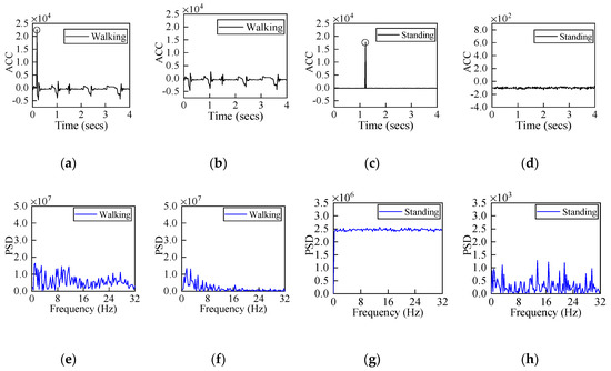 The results of the outlier processing of the acceleration signal while standing are shown in Figure 5c,d,g,h, which are the original signal, the signal after outlier processing, the power spectra of original signal, and the power spectra of the signal after outlier processing. Due to the existence of the outstanding outliers, the total energy of the signal in Figure 5c is substantially higher than that of the signal in Figure 5d. Moreover, the energy of the signal in Figure 5c is approximately equally distributed over the whole frequency spectrum (white noise).