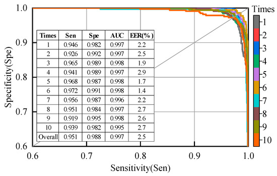In the second patient-dependent experiment, the samples used for training and testing were from all patients. In order to compare with the baseline, the sliding window length used in segmenting the acceleration signal is 256, and the step size is 64. Figure 8 shows specificity vs. sensitivity curves and AUC and EER values of the experimental results. Each curve represents the result of a cross-validation in this R10Fold evaluation. The overall results were sensitivity, specificity, accuracy, and F1-score of 0.951, 0.988, 0.981, and 0.947 respectively. This result is not as good as the first patient-dependent experiment. This phenomenon is reasonable. On the one hand, the gait features of each patient are different, which increases the difficulty of detection. On the other hand, because the step size of the sliding window becomes larger, the number of samples is reduced, which leads to insufficient generalization ability of the model.
