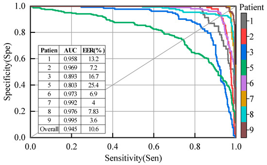 Figure 9 shows the results of each patient when evaluated using LOSO, excluding patients #4 and #10. Patients #3 and #5 provided the worst results. As can be seen in Table 3, the FOG events of these two patients accounted for a relatively high proportion, indicating that the patient’s condition may be heavier than other patients, and therefore contains more special gait features. During the LOSO evaluation, different from R10Fold evaluation, this unique gait features did not appear sufficiently in the training set, which leads to poor results. Except for patients #3 and #5, the AUCs of the remaining patients were all greater than 0.90, and the EERs were all less than 15%. This shows that the proposed model can also obtain good evaluation results in LOSO evaluation.