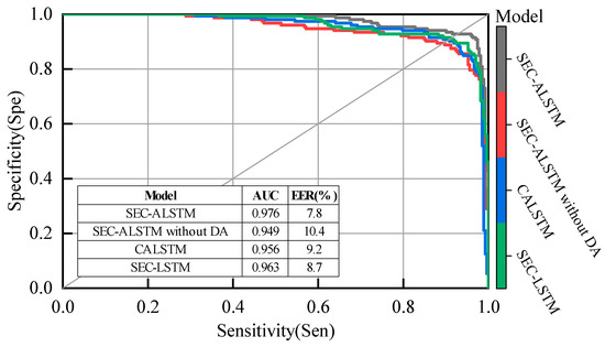We evaluated the gains of data augmentation, SE block, and attention mechanisms to model performance. For this purpose, we built four different models: the complete SEC-ALSTM model, the SEC-ALSTM model without data augmentation modules (SEC-ALSTM without DA), the SEC-ALSTM model without SE blocks (CALSTM), and the SEC-ALSTM model without an attention mechanism (SEC-LSTM). For comparison, all models differ from the SEC-ALSTM model only in their missing parts. The experimental settings are: the length of the sliding window is 256, the step size is 64, and using a LOSO evaluation. Without loss of generality, here only the experimental results for patient #8 are reported. The results of this comparison experiment are listed in Table 9. Figure 10 shows the curve for additional comparison of sensitivity and specificity. According to Table 9, the complete SEC-ALSTM model obtains the best performance. This means that each component has a certain gain to the performance of the model. The data augmentation module has the best effect on improving the sensitivity of the model, and the sensitivity of the model without data augmentation modules is reduced by 0.152; the SE block has the best specific effect on the enhancement model, and the specificity of the model without the SE block is reduced by 0.073.