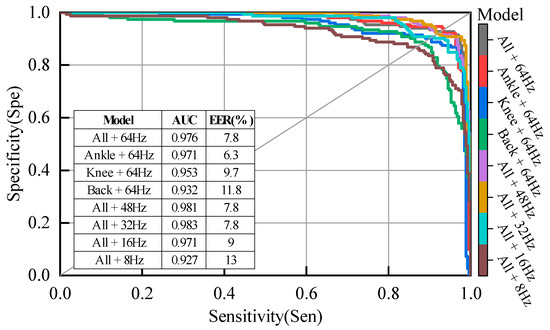 In addition, we also compared the impact of different sampling frequencies of sensors on detection performance. The frequency of the original acceleration signal is resampled to 16, 32, and 48 Hz. It can be seen from the results in Table 10 that as the sampling frequency decreases, the detection performance gradually declines, and this situation becomes more obvious when the sampling frequency is lower than 32 Hz. Compared with the sampling frequency of 64 Hz, when the sampling frequency is 8 Hz, the sensitivity is reduced by 0.111 and the specificity is reduced by 0.04.