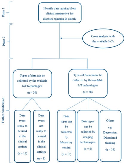 In the next step, a cross-case analysis was undertaken between the required clinical data from Phase 1 (Table A1) and the hierarchy of available IoT applications for elderly healthcare (Figure A1). The final objective in this phase was to identify which types of clinically required data for the targeted common elderly diseases could be collected using IoT applications and devices and whether they were acceptable from the clinical perspective. The full list of the results of this phase is shown in Table A2.