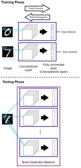 We illustrate the procedure of training and testing phases of BAN for MNIST (Modified National Institute of Standards and Technology) [] examples in Figure 1. During the training phase, we train two sub-networks with labeled data (see the blue box in Figure 1), “0” images and “7” images, respectively, by computing the loss function defined in Equation (1). After the sub-networks have converged, we assemble them together to form a BAN as depicted with a red box in the testing phase. To test a new image, we calculate the distances between user-defined values of characteristic layers, C, and predicted values of characteristic layers in BAN. Then, we classify the image into a specific label which corresponds to the lowest distance as defined in Equation (3):