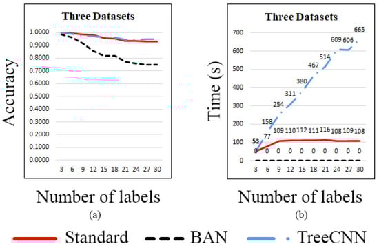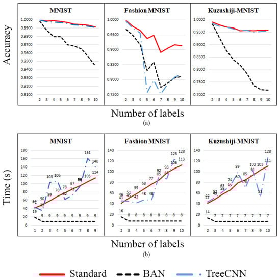 Figure 3a presents the accuracy results of the standard neural network, BAN, and TreeCNN which have been trained with different number of labels at the 50th epoch, whereas Figure 3b shows the total time used to train classifiers by incrementally adding one new label each from the three datasets to each classifier in 50 epochs. Since BAN has trained ten labels from each dataset in Section 5.1.1, then we can use the trained sub-networks directly without any training procedure in this sub-section. Therefore, the total time used to train BAN is 0 for all cases in Figure 3b. Although the accuracy of BAN is lower than the standard neural network and TreeCNN in Figure 3a, we conjecture that it can be increased by using different settings on the sub-network such as the activation function, the number of neural nodes on the characteristic layers C, the user-specified threshold , etc. We will discuss the fine-tuning for the sub-network as our future research directions.