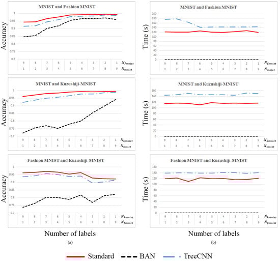 The performance of the standard neural network, BAN, and TreeCNN on a mixture dataset: (1) MNIST and Fashion MNIST (1st row), (2) MNIST and Kuzushiji-MNIST (2nd row), and (3) Fashion MNIST and Kuzushiji-MNIST (3rd row), at the 50th epoch respectively. (a) Top 3 images from the left show the accuracy of the classifiers; (b) Top 3 images from the right show the total time used to train the classifiers. Note that “Standard” refers to the standard neural network.