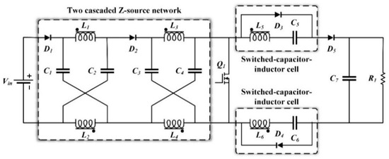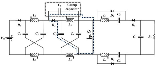 As it can be seen from Figure 1, the proposed high step-up DC–DC impedance source based boost converter includes two cascaded Z-source networks and two switched-capacitor-inductor cells. The converter hires a single ferrite core with six coupled inductors, which are part of the impedance network and cells. The very high input current ripple and the high voltage stress of the switch are two main problems in this converter. Therefore, some inevitable alterations are required in order to make the converter practically applicable. Although by adding a capacitor as shown in Figure 2, the voltage stress of the switch clamps at a specific value, the high input current ripple is still considered as a drawback in this converter. The dashed line in Figure 2 represents how the KVL (Kirchhoff’s Voltage Law) loop clamps the switch voltage at a specific value. Eventually, the final modification into the converter configuration resulted in obtaining a high step-up converter with low input current ripple and low voltage stress for semiconductor devices. Figure 3 shows the modified proposed high step-up impedance source converter with an equivalent circuit of coupled inductors. The proposed converter is composed of a single switch Q1; one diode D1 in the impedance network; two diodes in the cells D2 and D3; and one output diode D4; six coupled inductors L1, L2, L3, L4, L5, and L6; four capacitors C1, C2, C3, and C4 in the impedance network; two switched-capacitors C5 and C6; and output capacitor C7.
