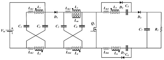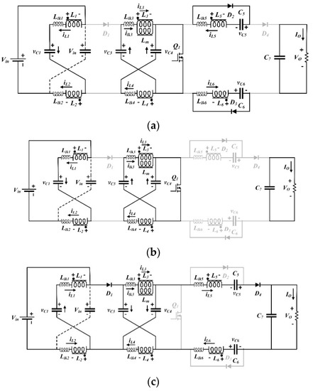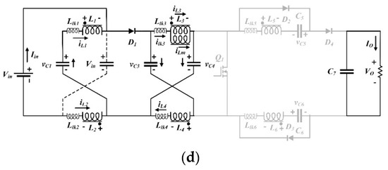 Interval 1 [t0 < t < t1] (Figure 4a): Before the t0 input, diode D1 is conducting, and the other semiconductor devices are off. At t0, the switch Q turns on, diode D1 becomes reverse-biased, and (2 + n)VC − Vin is applied across it. In addition, the current direction of capacitors C3 and C4 become reverse. In this operation mode, the capacitor voltage of C3 and C4 applies to inductors L3 and L4, and consequently this voltage will be induced to other coupled inductors L1, L2, L5, and L6 by considering the turn ratio. In this stage, the energy of leakage inductances L1 and L2 are recycled to the input voltage source, and the energy of leakage inductances L5 and L6 are absorbed by switched-capacitors C5 and C6. The following equations are established in this time interval: