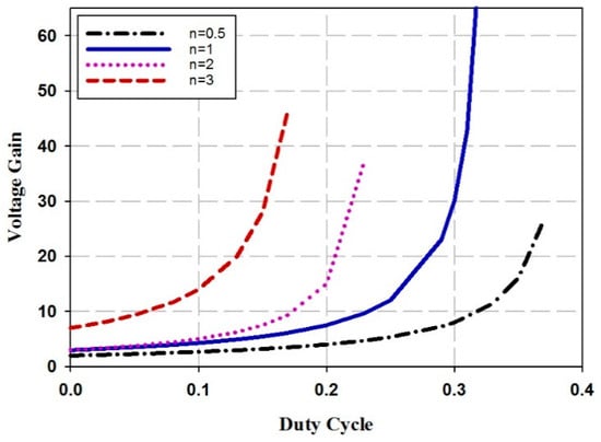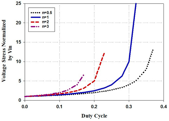Figure 8 shows the voltage stress of the switch for different turn ratios of coupled inductors by varying the duty cycle; as it can be observed, by increasing the turn ratio, the voltage stress increases as well. Moreover, Figure 9 demonstrates the voltage stress of the proposed converter compared with converters in [12,18,19]. The voltage gain varies from 5 to 15, and the voltage stresses of the switch for the converters are compared with each other. As it can be seen from Figure 9, the stress voltage of the switch in the proposed converter and the converter in [19] is lower than that of the two other converters.