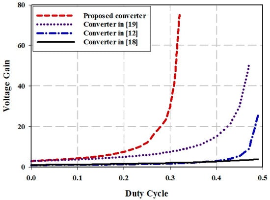 Voltage gain of the proposed converter vs. converters in [12,18,19].