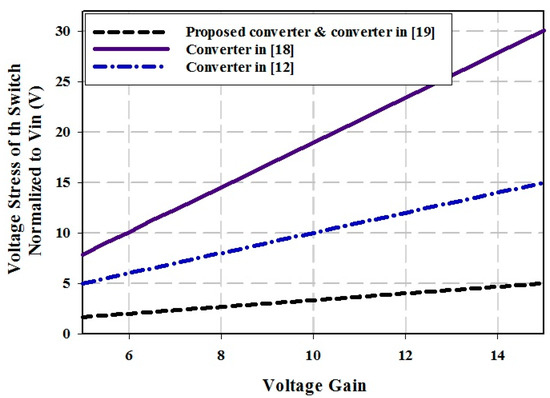 Voltage stress of the switch in the proposed converter and the converters in [12,18,19].