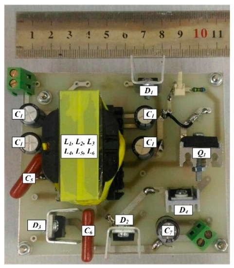 To compare the performance of the proposed converter in practice, a real prototype of the converter was implemented, and experimental results are provided in order to verify the theoretical analysis. Figure 10 shows the real implemented prototype. The implemented converter operated at 50 kHz to convert the 25 V input voltage to 300 V with a nominal power of 100 W for the load.
