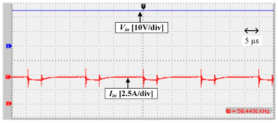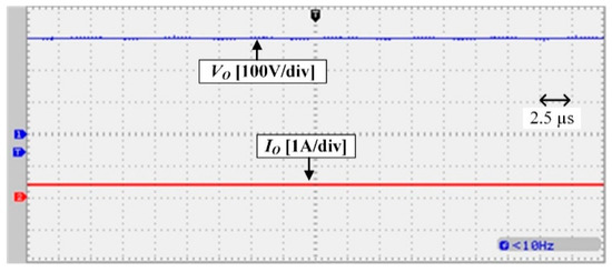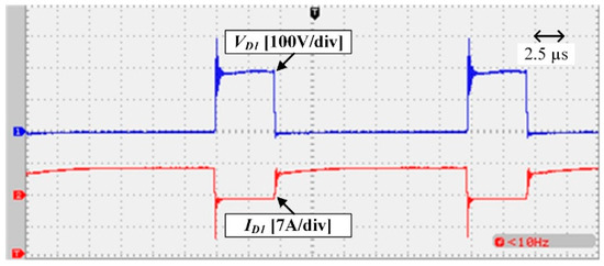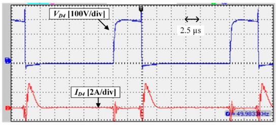 Experimental waveforms of the implemented prototype are illustrated in Figure 11, Figure 12, Figure 13, Figure 14 and Figure 15. The input current and voltage of the converter are shown in Figure 11; the low input current ripple can be observed in this figure. Figure 12 shows the voltage and current of diode D1; the voltage and current waveforms of the switch are shown in Figure 13. It can be seen that regarding the output voltage of 300 V, which is illustrated in Figure 15, the stress voltage of MOSFET is 100 V. Finally, the voltage and current of diode D4 can be seen in Figure 14.