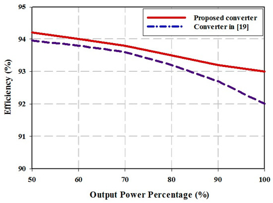 The efficiency of the proposed converter was calculated by measuring the input and output current and voltage of the converter by means of DC current and voltage meters, respectively. Figure 16 shows the efficiency of the implemented proposed converter from 50% to 100% of a full load condition and it is compared with the converter in [19]. As it can be observed, by increasing the output power, conduction losses increase as well and lead to dropping the efficiency slightly. Moreover, under a full load condition, the measured efficiency is 93%.