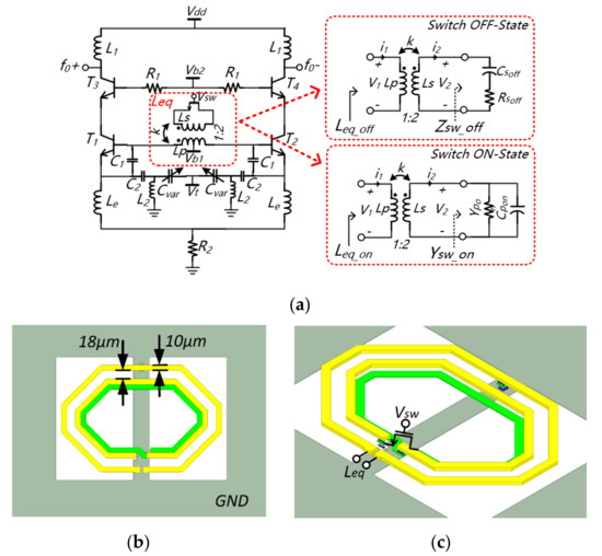 (a) Schematic of the Colpitts voltage-controlled oscillator (VCO), and equivalent circuits of switched inductor at switch ON/OFF state; (b) top view of the Q-boosted switched inductor; (c) 3-D view of the Q-boosted switched inductor with 1:2 inductor-loaded transformer.