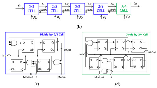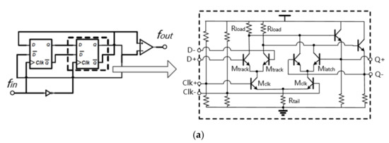 The prescaler consists of three current mode logic (CML) divide-by-2 stages [9], as shown in Figure 3a, which divides the K-band VCO output to ~3.2 GHz signal. The CML divider has the advantages of small area and wider operation bandwidth, compared to the injection-locked frequency divider (ILFD). Circuit parameters are optimized for each CML stage to get a better RF performance and lower power consumption for input signals around ~26/~13/~6.5 GHz. The programmable divider includes four stages of true single-phase clock (TSPC) divide-by-2/3 cells, followed by one stage of a divide-by-3/4 cell, as shown in Figure 3b. The divide-by-2/3 cell and divide-by-3/4 cell are shown in Figure 3c,d, respectively. Between the SDM outputs and programmable divider control inputs, additional D-type flip-flops and logic gates are placed to eliminate wrong settings due to a glitch or a synchronous failure in the system.