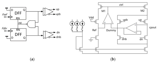The PFD compares the reference signal, Fref, and the divided signal, Fdiv, and controls the CP current according to the phase and frequency difference, as shown in Figure 4a. The charge pump needs to provide matched up and down currents for most of the CP output voltage range. The charge pump architecture employs dual operation amplifiers (Op-amps) where both amplifiers utilize a high swing topology [15]. The first amplifier acts as a unity gain amplifier to track the change of VCO control (cpout) node to the dummy node, while the second amplifier forms the feedback loop where the gate voltage of PMOS in the up current path is tracked to keep the current the same as that of NMOS. Using this technique, good matching between up and down currents can be obtained. Op-amps also suppress the supply noise and reference spurs. Hence the operation around the supply/ground edge is the worst case scenario as the Op-amp gain is reduced, which should be avoided in the CP output voltage range. The CP includes three binary weighted branches so that the current can be digitally controlled from 50 μA to 350 μA, adapting the PLL’s loop bandwidth/settling time for various chirp configurations.