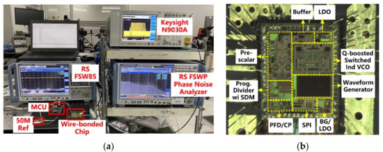 (a) Measurement setup environment for the f0 output spectrum (with Keysight N9030A), chirp signal analyzing (with R&S FSW85), and phase noise (with R&S FSWP Phase Noise Analyzer) of the K-band FMCW source chip; (b) photograph of the wire-bonded K-band FMCW source chip.