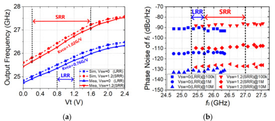 Figure 6a shows the measured output frequency range of the K-band Q-boosted switched inductor VCO, which is from 24.738 to 26.447 GHz for switch OFF-state (Vsw = 0 V), and 25.438 to 27.566 GHz for switch ON-state (Vsw = 1.2 V). Both are 0.04~0.1 GHz lower than the simulated results, possibly due to the parasitics from the circuit layout and active model inaccuracies. If followed by a frequency tripler, the VCO can cover 76~77 GHz (for LRR application) when the varactor tuning voltage, Vt, is at 0.68~1.18 V for switch OFF-state, and 77~81 GHz (for SRR application) when Vt is at 0.21~1.59 V for switch ON-state. At these tuning voltage ranges, the CP has well-matched up/down currents, which helps to optimize the phase noise and spur performance for the proposed FMCW frequency synthesizer. Meanwhile, the average VCO gain, Kvco, is approximately 0.76 GHz/V for Vsw = 0, and 1.02 GHz/V for Vsw = 1.2 V. The lower Kvco value at Vsw = 0 will also improve the phase noise for LRR applications.