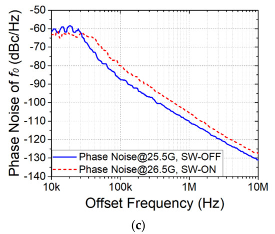 Figure 6b shows the measured Q-boosted switched inductor VCO phase noise from 100 kHz to 10 MHz offset at switch OFF/ON states. VCO shows best phase noise (blue dots) at switch OFF state (Vsw = 0 V), with −115 dBc/Hz@1 MHz, which is desirable for LRR applications. At switch ON-state (Vsw = 1.2 V), the phase noise (red dots) is −110.7 dBc/Hz@1 MHz. Thanks to the Q-boosted switched inductor technique, the VCO phase noise at switch ON-state can be improved by 3~4 dB, compared to the conventional switched inductor VCO [8]. Figure 6c shows the measured phase noise of the K-band FMCW frequency synthesizer, which is −110.5 dBc/Hz@1 MHz at 25.5 GHz (switch OFF-state, blue line), and −106 dBc/Hz@1MHz at 26.5 GHz (switch ON-state, red line), respectively. The loop bandwidth of the synthesizer is designed as ~30 kHz. Compared to the stand-alone Q-boosted switch inductor VCO, the out-of-band phase noise of FMCW frequency synthesizer degenerated by 4~5 dB at 1 MHz offset, which is probably due to the noise coupling from the chip substrate and on-chip power supply.