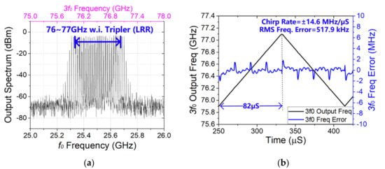 Figure 7a shows the measured output spectrum for the FMCW source when the VCO inductor switch is at OFF-state. The output spectrum has been converted to 3f0 frequency, based on the K-band f0 chirp from 25.3~25.7 GHz. Figure 7b clearly shows a modulated triangular shape consisting of repeated up and down chirps with bandwidth of 1.2 GHz and duration of 82 μs, which gives the chirp rate of ±14.6 MHz/μs. The normalized root mean square (RMS) frequency error is 517.9 kHz, including the joint points between up and down ramps.