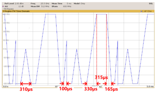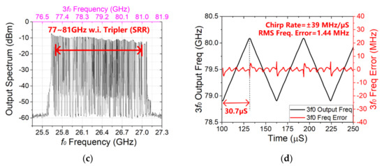 Figure 7c shows the measured output spectrum when the VCO inductor switch is at ON-state. The output spectrum has also been converted to 3f0 frequency, based on the K-band f0 chirp. For SRR application, the chirp rate needs to be high to avoid baseband flicker noise, and chirp bandwidth needs to be wide to permit measurements of reasonably large speeds. Limited by the chirp analyzing bandwidth of the R.S. signal spectrum analyzer FSW85, the measured chirp bandwidth for f0 is set as 400 MHz, or equivalently 1.2 GHz for 3f0 signal. Figure 7d shows a modulated triangular chirp signal with a bandwidth of 1.2 GHz and a duration of 30.7 μs, which gives a chirp rate of ±39 MHz/μs. Meanwhile, the loop bandwidth of the synthesizer has been set as 0.5~1 MHz, in order to lower down the RMS frequency error at high chirp rate. The normalized root mean square (RMS) frequency error is 1.44 MHz.