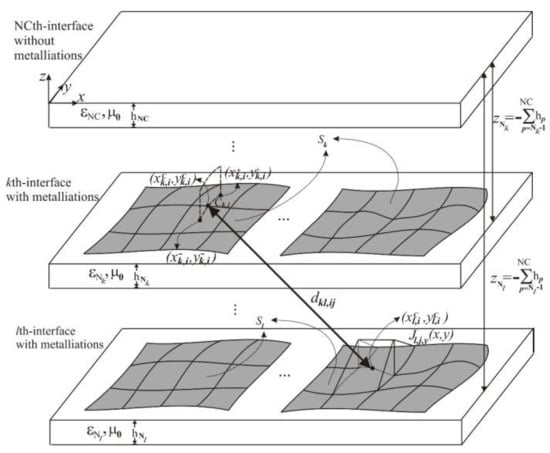 - Michalski, K.A.; Zheng, D. Electromagnetic scattering and radiation by surfaces of arbitrary shape in layered media, part I: Theory. IEEE Trans. Antennas Propag. 1990, 38, 335–344. [Google Scholar] [CrossRef]