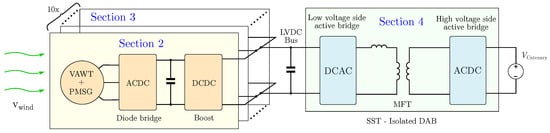 In SSTs an isolated dual active bridge (DAB) is a key topology [,]. This isolated DAB converter provides a high voltage ratio between low and high voltage sides, ensuring electrical isolation due to the Medium Frequency Transformer (MFT).