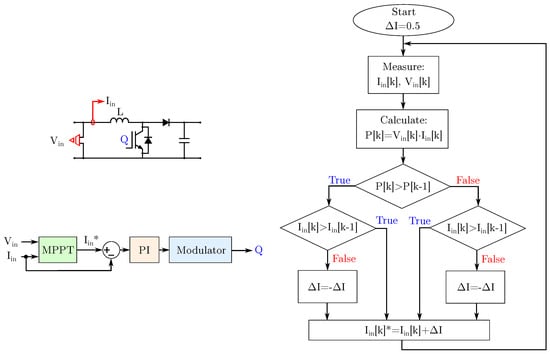 The method used to obtain the maximum power point in this system is the one so called Hill Climb Search (HCS). It is a DPC method, since it uses electrical parameters to obtain the maximum power point. Although the performance of this MPPT technique is moderate, it is very simple both from the point of view of the algorithm and the requirements needed. The amount of current delivered by each boost converter is calculated by measuring input current and voltage (Figure 3). This input current and voltage are multiplied in order to obtain the power. Perturbing the input current set point, the new power is calculated. Considering an increment/decrement in the set point and measuring the increment/decrement of the input power, the set point reaches the maximum power point by climbing the power hill.