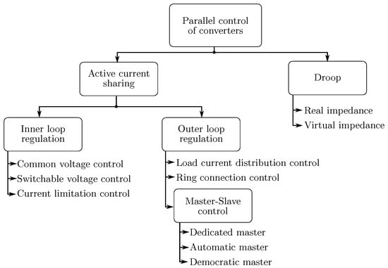 Considering two sources in parallel supplying a load, there is a need to avoid circulating current between both sources [,,]. These currents generate undesired losses and fluctuations in the system, so to control the power delivery from paralleled converters there are several techniques [,,,,,]. Some of these techniques to control paralleled converters are classified in Figure 4.