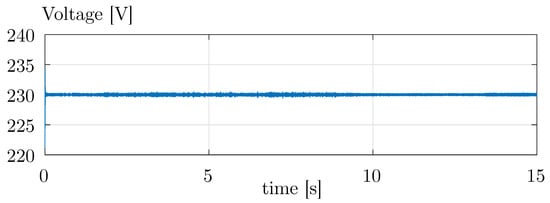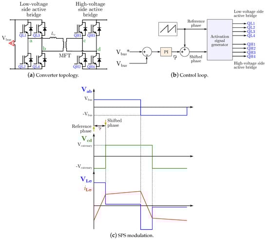 In this paper, the SPS has been selected, since it is widely used and easy to implement [,,]. The phase shift magnitude controls the active power flow between both sides of the DAB. In this work, the phase shift is controlled by setting the low side voltage to a DC value of 230 V (Figure 5b).