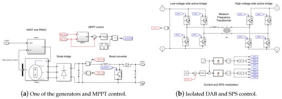 The wind energy harnessing system has been modeled in Matlab®/Simulink®. The VAWT, PMSG and the boost converter are shown in Figure 6a, and the SST model is shown in Figure 6b, listing the parameter values in Table 2.