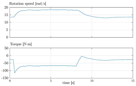 The average wind speed in the location is about 5 m/s without the train going by. Moreover, the wind speed while the train goes by has been simulated in order to estimate it, concluding a maximum wind speed of 7.7 m/s nearby the wind turbine []. In Figure 7, the torque and rotational speed of the PMSG during the train displacement are plotted.