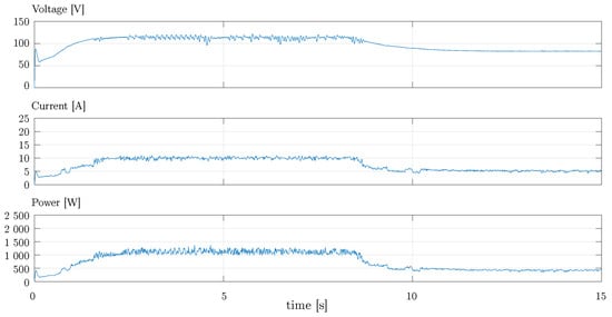 The plotted voltage, current and power in Figure 8, tries to show the changes in their value according to the scenario of the train going by. Both the voltage and current change due to the MPPT technique, to extract the maximum power in every instant.