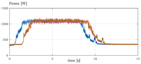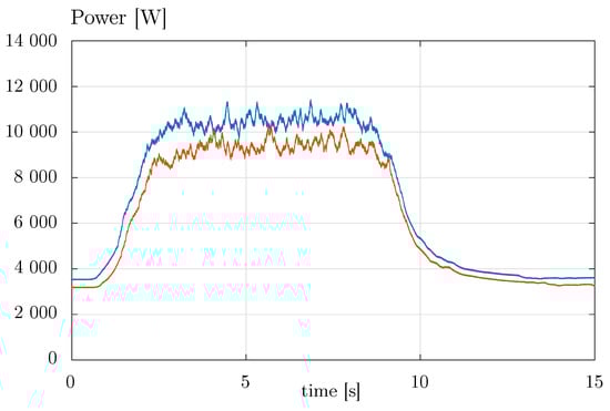 Finishing with simulation results, the total power delivered to the catenary is plotted in blue in Figure 11, generating up to 11 kW of peak power, and almost 3.5 kW with a constant wind speed of 5 m/s.