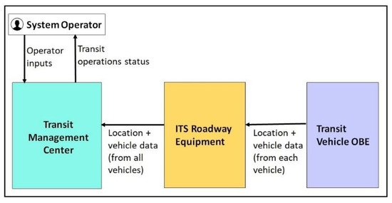Selection of an ITS architecture for the transit vehicle tracking service is based on work presented in [13,15]. First, the ITS architecture proposed for the service [13], based on the American ITS architecture known as ARC-IT [34], was reviewed, which was. The proposed architecture for the PT01 service (PT01 is transit vehicle tracking in ARC-IT) was also reviewed. Additionally, the review included proposals for other reference architectures at an international level (such as European Intelligent Transport Systems Framework Architecture, often now known as The FRAME Architecture [35]) regarding the transit vehicle tracking service.