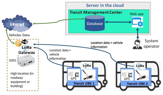 LoRa is adequate for communication between vehicles and information centers in a transit vehicle tracking service, in terms of frequency of messages, size of each message, and latency. A tracking service does not require a high frequency of messages, a maximum of 15 messages per minute from each vehicle is enough for locating a vehicle with enough accuracy; the principal data in each message are coordinates (latitude and longitude) that account for a relatively short message (which could also be encoded to reduce its size) [2]; and the latency of each of the messages is not critical, since the location of a vehicle can be reported with up to 1 s of delay without a considerable effect. LoRa technology has a high enough data rate to handle the required message rate; the size of the packet, although limited, is adequate for this type of service; and latency is low enough to have transmission delays of less than 1 s in the distances handled in a tracking service [3,4].