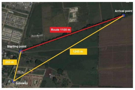 Experiment 6 was designed to verify the impact on communications that may occur when vehicles travel at speeds between 20 and 60 km/h. The route followed by the vehicle in Experiment 6 is presented in Figure 6 (red arrows). The figure also shows the distances between the gateway and the starting and ending points of the route (yellow lines). Three vehicles were used, and 17 settings (the ones used in Experiment 5) were used. One packet was sent every 7 s (the frequency of sending packets was increased, considering that the speed of the vehicle was higher). Vehicles departed from the starting point every 15 s. All vehicles were driven at a maximum speed of 60 km/h. Once all vehicles finished the route, packet sending was stopped, and the devices and vehicles were configured for the next run.