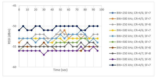In Experiment 1, the setting corresponding to SF = 7, BW = 250 kHz, CR = 4/6 yielded the best average RSSI value (−50.36 dBm). This setting, at 20 m, had an average RSSI value of −73.40 dBm, located approximately in the middle of the settings ordered under the same criteria. Therefore, by increasing the distance, this setting worsened its signal level received at the gateway much more than expected. The worst setting of Experiment 1 was SF = 7, BW = 125 kHz, CR = 4/8, its average RSSI value was −62.66 dBm, a performance that was maintained when the distance was scaled to 20 m, placing it between the ten worst settings.