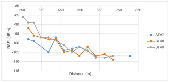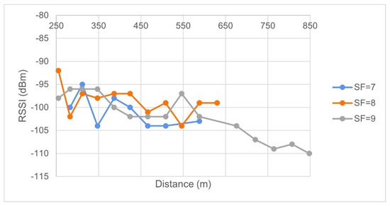 Although there is some variability in the RSSI levels obtained for the three settings (see Figure 12), the range of values in which most of the values vary (before 650 m) is less than 15 dBm. In settings with an SF of 10 packets were received above 750 m, however the RSSI decreased by a few dBm. It was possible to validate in some other cases that with a high SF, higher distances can be achieved with a lower RSSI. Figure 13, shows that with SF = 9 (BW = 125 kHz and CR = 4/6) a greater distance was reached.