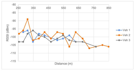 The results obtained in the six experiments show the behavior of LoRa transmission (with respect to the percentage of packets received and the RSSI level) is quite variable when the distance, and the number of LoRa devices are scaled, using the same values for SF, BW and CR. It was not possible to determine a setting that had a constant behavior for all the tested distances and for different number of nodes. However, one setting had an adequate behavior in most of the experiments, mainly in the final three: SF = 9, BW = 250 kHz, CR = 4/5, where the percentage of packets received was between 87%, 81%, and 75% the RSSI level was acceptable (between −95 and −103 dBm) and the maximum distance reached was adequate (between 848 and 820 m). This setting is important, because it scaled well in terms of distance, number of vehicles and vehicle speed in most of the six performed experiments (except for Experiment 3).