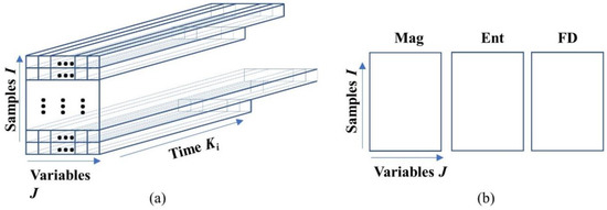 As shown in Figure 1b, each set of the features extracted from all variables will be put side by side in the sequence of Mag, Ent, and FD. An unfolding result in the format of a two-dimensional matrix will be formed with the size of . Here, H is the number of spectral features, and H = 2 in this paper.
