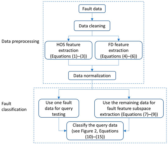In this section, the proposed fault classification method is evaluated using a simulation example and real manufacturing data from a semiconductor metal etch process [1]. Figure 2 illustrates the workflow of the evaluation process for the proposed feature selection and fault classification method. It mainly includes two steps: data preprocessing and fault classification. In data preprocessing, the missing data are cleaned in fault data. Then, HOS and FD features are extracted using Equations (1)–(6), and are stacked into a feature matrix, as shown in Figure 1b. The feature matrix is normalized to have mean 0 and standard deviation 1 using the mean and standard deviation of calibration data. In fault classification, one fault data used for testing and the remaining data for the Equations (1)–(6) to extract the fault feature subspace. The leave-one fault is used to test the classification accuracy by the Equations (7)–(15). For the whole dataset of each fault type, such a leave-one-out test will be calculated. The average accuracy of fault classification for each fault type is calculated.